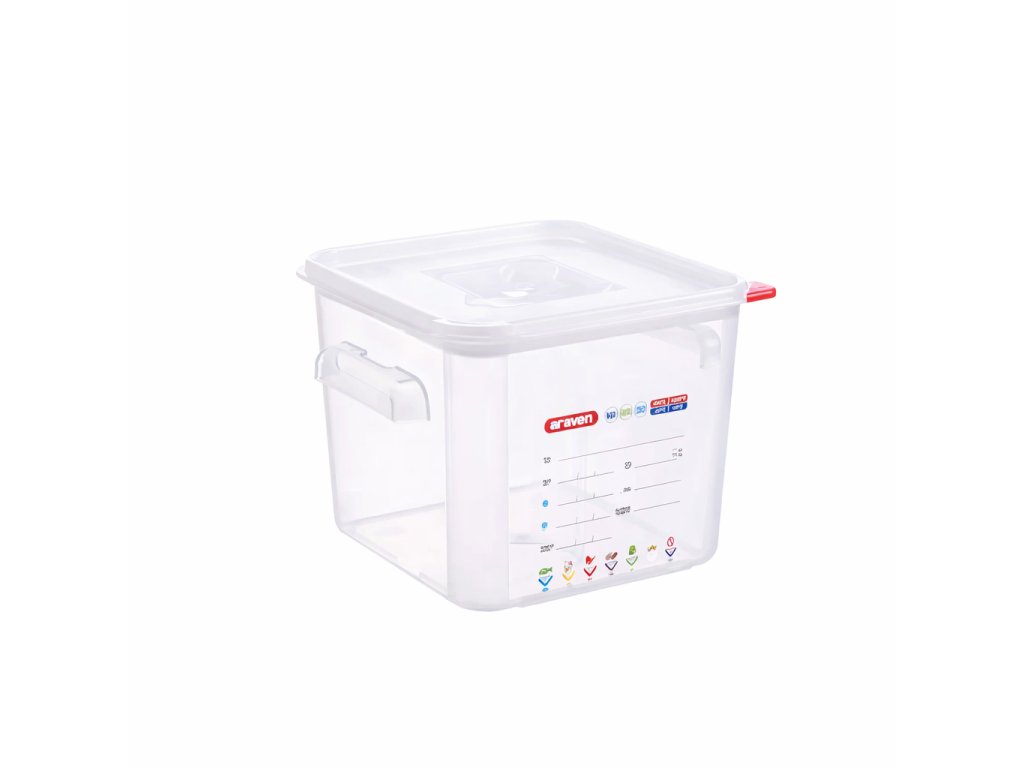 Čtvercový tvar nádoby efektivně využívá skladovací prostor a minimalizuje nevyužité místo. Vnější boční úchyty usnadňují manipulaci a přenášení. Vzduchotěsné víko z materiálu LDPE zajišťuje úplnou ochranu potravin a díky své pružnosti se snadno přizpůsobí tvaru nádoby.