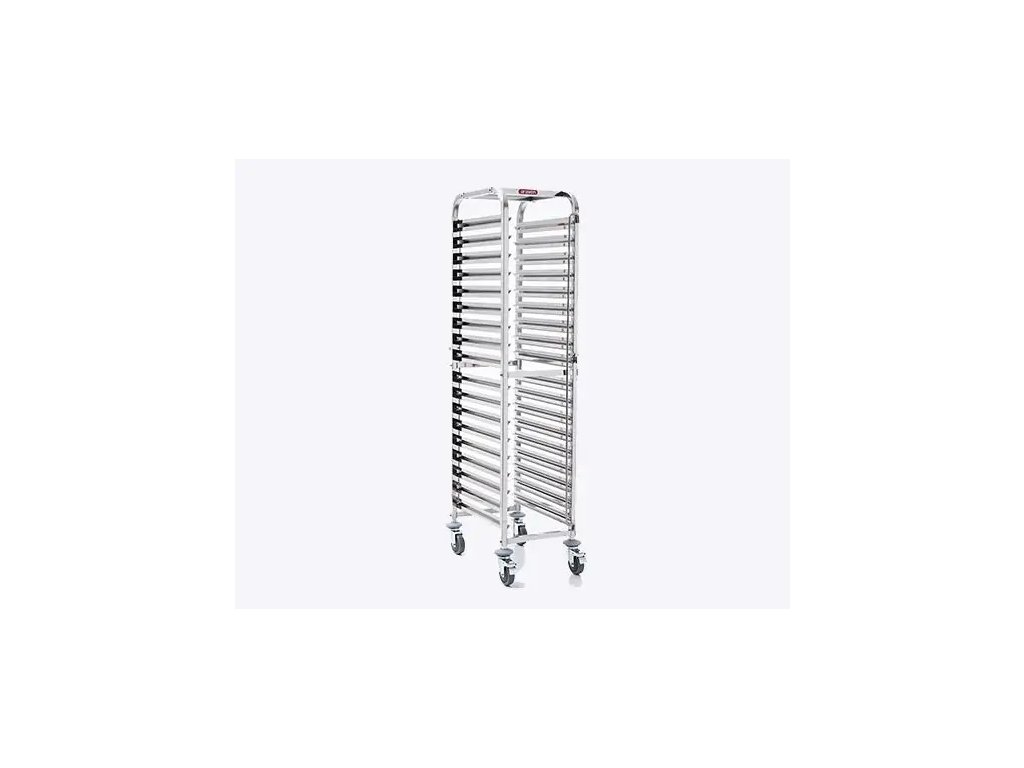 Regálový vozík Araven GN 1/1 je určen pro bezpečné skladování a snadnou manipulaci s gastronádobami. Pojme až 18 nádob GN 1/1 a je vybaven zajišťovací lištou proti vypadnutí. Otočná kolečka (360°), z toho dvě s brzdou, umožňují snadné a bezpečné přesouvání i fixaci na místě. Ochranný gumový lem chrání konstrukci před nárazy.
