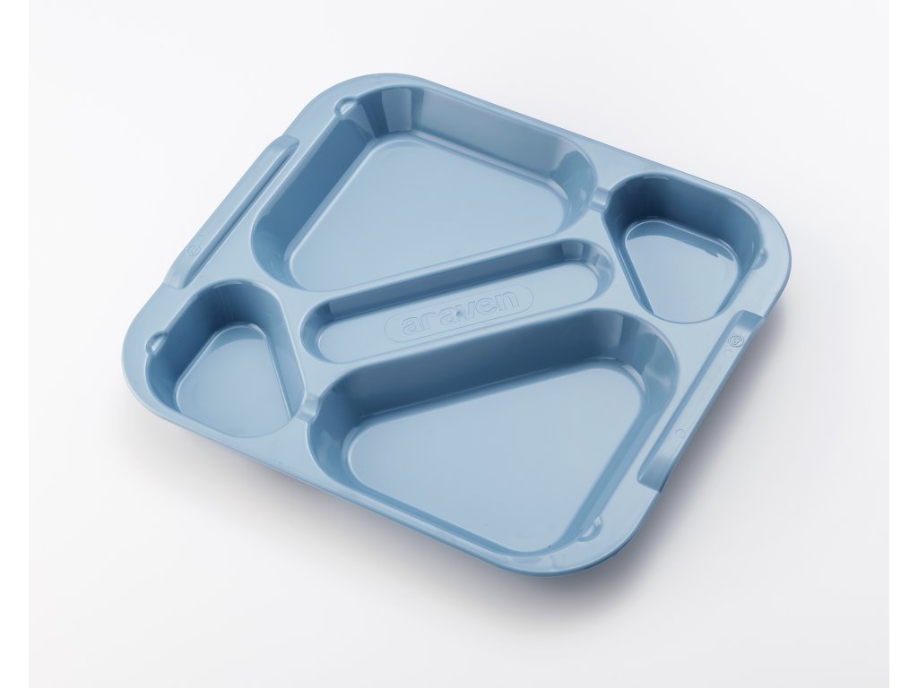 Podnos má prostor pro různé potraviny, takže nejsou potřeba talíře. Pět přihrádek: dvě velké na hlavní jídla, dvě malé na dezert, ovoce, chléb, sklenici… s obdélníkovým prostorem uprostřed pro příbory. Přihrádky na potraviny mají zářezy, o které se příbory při používání opírají a brání jejich zasouvání do mezer. Boční úchyty na tácu usnadňují držení a přenášení, a to i pro děti. Podnos s jídlem může být skutečně zakryt prázdným obráceným podnosem, aby bylo jídlo chráněno, dokud nebude připraveno ke konzumaci.Doplňkové parametry