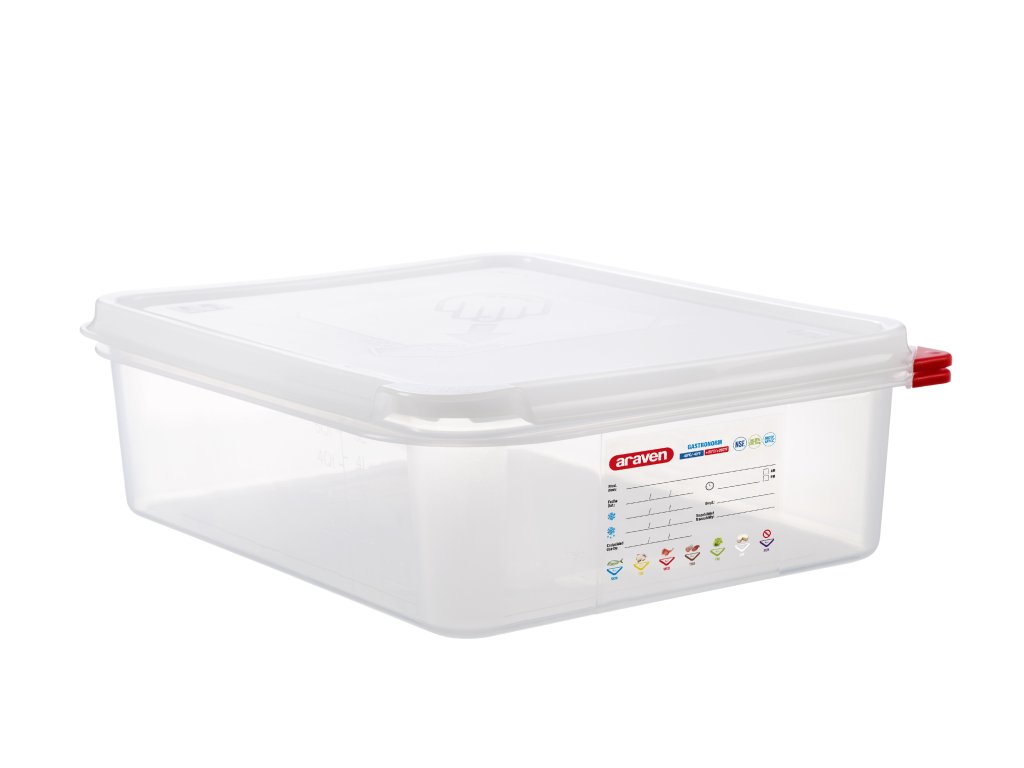 Polypropylenové vzduchotěsné nádoby navržené pro gastronomické profesionály. Vzduchotěsná nádoba je k dispozici ve velikostech GN. Vzduchotěsná nádoba na potraviny má trvalý štítek podle nařízení o sledovatelnosti Reg. (CE) n.852/2004 Reg(CE) n.178/2002 S ARAVEN je snadné psát na etiketu s fixem s netoxickým inkoustem ARAVEN a etiketa zůstane jako nová i po opakovaném mytíDoplňkové parametry