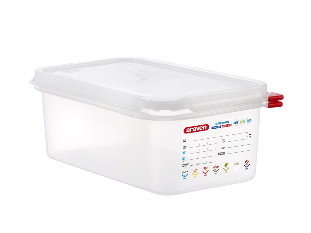 Polypropylenové vzduchotěsné nádoby navržené pro gastronomické profesionály. Vzduchotěsná nádoba je k dispozici ve velikostech GN. Vzduchotěsná nádoba na potraviny má trvalý štítek podle nařízení o sledovatelnosti Reg. (CE) n.852/2004 Reg(CE) n.178/2002 S ARAVEN je snadné psát na etiketu s fixem s netoxickým inkoustem ARAVEN a etiketa zůstane jako nová i po opakovaném mytíDoplňkové parametry