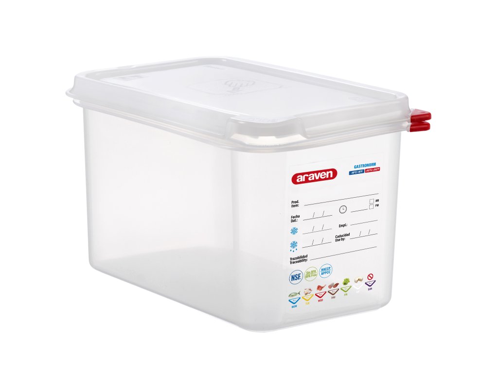Polypropylenové vzduchotěsné nádoby navržené pro gastronomické profesionály. Vzduchotěsná nádoba je k dispozici ve velikostech GN. Vzduchotěsná nádoba na potraviny má trvalý štítek podle nařízení o sledovatelnosti Reg. (CE) n.852/2004 Reg(CE) n.178/2002 S ARAVEN je snadné psát na etiketu s fixem s netoxickým inkoustem ARAVEN a etiketa zůstane jako nová i po opakovaném mytíDoplňkové parametry