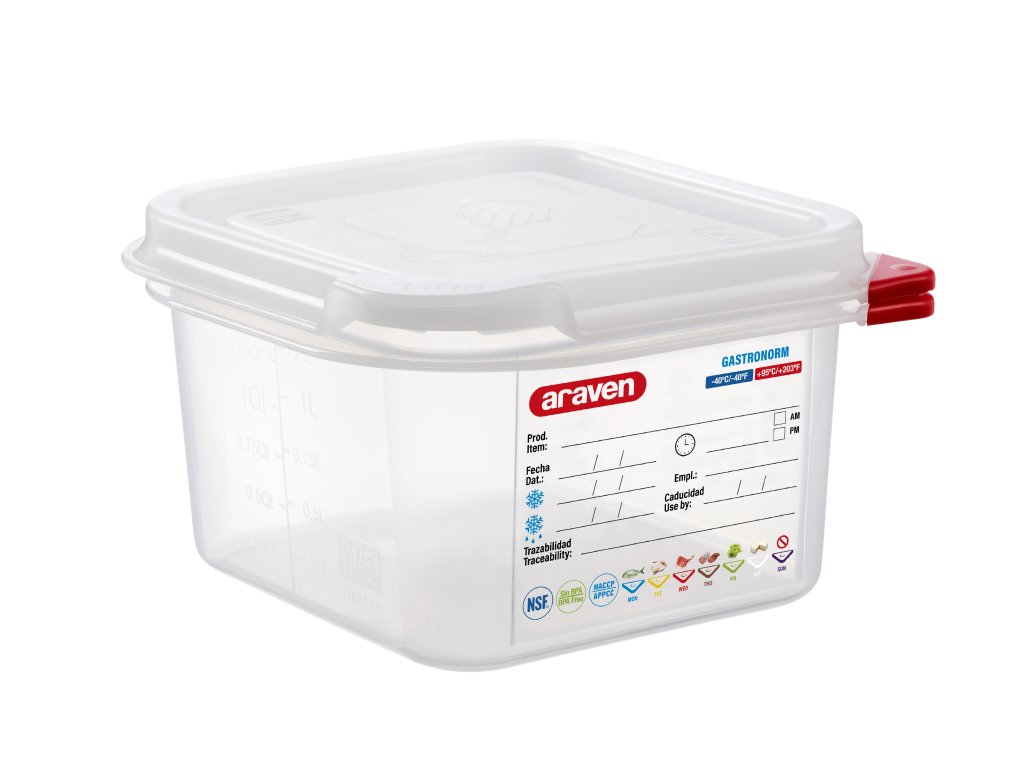 Polypropylenové vzduchotěsné nádoby navržené pro gastronomické profesionály. Vzduchotěsná nádoba je k dispozici ve velikostech GN. Vzduchotěsná nádoba na potraviny má trvalý štítek podle nařízení o sledovatelnosti Reg. (CE) n.852/2004 Reg(CE) n.178/2002 S ARAVEN je snadné psát na etiketu s fixem s netoxickým inkoustem ARAVEN a etiketa zůstane jako nová i po opakovaném mytíDoplňkové parametry