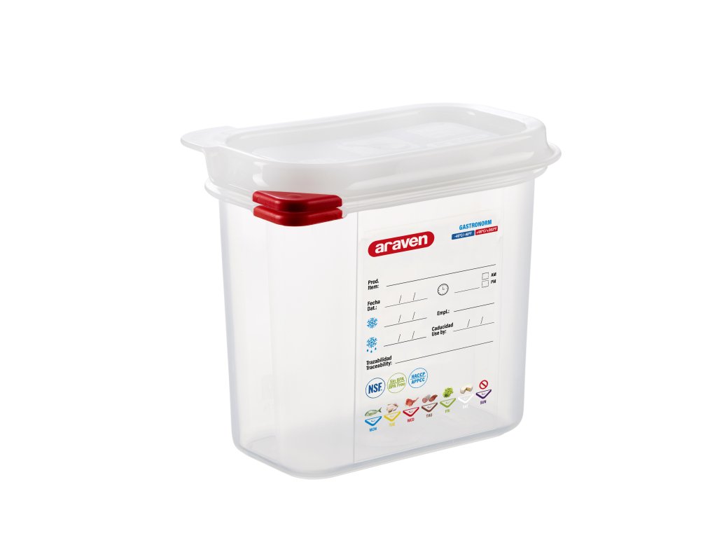 Polypropylenové vzduchotěsné nádoby navržené pro gastronomické profesionály. Vzduchotěsná nádoba je k dispozici ve velikostech GN. Vzduchotěsná nádoba na potraviny má trvalý štítek podle nařízení o sledovatelnosti Reg. (CE) n.852/2004 Reg(CE) n.178/2002 S ARAVEN je snadné psát na etiketu s fixem s netoxickým inkoustem ARAVEN a etiketa zůstane jako nová i po opakovaném mytíDoplňkové parametry