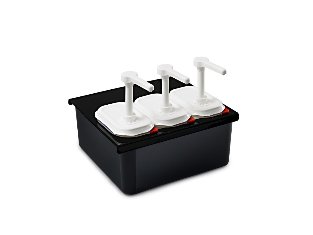 Stojan 3 dávkovačů GN 1/9 1,5 l na omáčky, dresinky, sirupy...Zlepšuje prezentaci omáček v servírovacích a výstavních prostorách. Užitečné pro přenášení dávkovačů na jejich skladovací místo. Udržuje teplotu omáček v dávkovači. Vložení vody s kostkami ledu nebo horké vody do černé nádoby GN 2/3 udržuje teplotu dávkovačů omáček.Doplňkové parametry