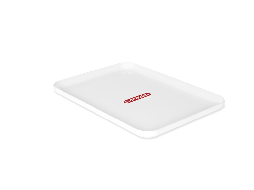 Plochý bílý tác pro vystavení potravin, u kterého byla věnována velká péče designu a funkčnosti, aby se uspokojily očekávání obsluhujícího i kuchyňského personálu. Tácy Araven lze použít pro jakýkoli typ potravin a dodávají se v různých kapacitách s velkým množstvím velikostí a povrchových úprav. Vysoce lesklé podnosy pro vynikající prezentaci potravin. Ploché, hluboké a servírovací podnosy Araven jsou vyrobeny ze SAN, což je velmi průhledný materiál, když není obarven, což mu dodává vysokou viditelnost a lesk. Po smíchání s barvivem získá materiál vysoce profilovaný obraz, který je nezbytný pro účely vystavení potravin. Je tuhý, ale křehčí než ostatní materiály. Řada navržená tak, aby se přizpůsobila displeji jakémukoli typu potravin díky velké rozmanitosti dostupných velikostí a povrchových úprav.Doplňkové parametry